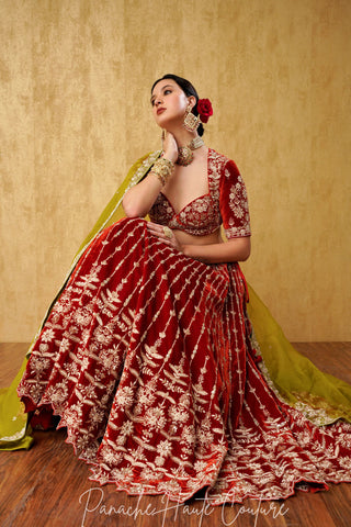 To complete the look, this ensemble comes with a hand-embroidered cape made from delicate net fabric. The cape features intricate embroidery in a complementary shade of green, adding a touch of elegance and sophistication to the overall look.