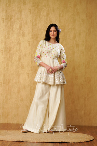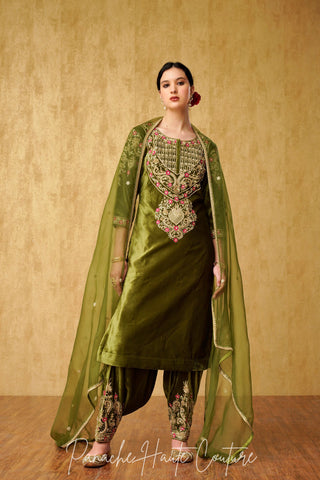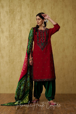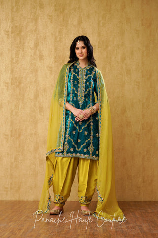 This Punjabi suit is a perfect combination of elegance and luxury. The kameez is made of silk velvet and features intricate gotta, dori, and pearls embroidery that adds a touch of glamor to the outfit. The embroidery is done by skilled artisans, making each piece unique and special.