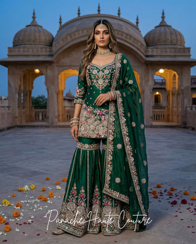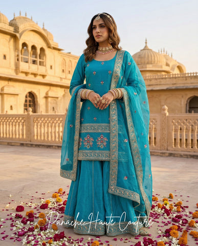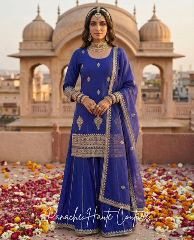 Panache Statement: The shararas in this collection are adorned with dori, gotta, thread, and zardozi embroidery, each requiring extensive time and meticulous craftsmanship. To ensure impeccable quality, superior craftsmanship, and flawless finishing, the embroidery timeline cannot be expedited. The lead time for this sharara set is 3 months. We appreciate your patience as we create this masterpiece for you.