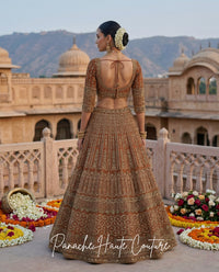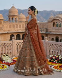 Fizza – Burnt Heena Tulle Net Couture Lehenga | Ruhani Collection