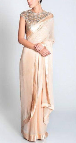 The embroidered raw silk bodice steals the spotlight with intricate zari and resham work. Adorned with cap sleeves, the bodice combines opulence and sophistication, enhancing the overall charm of the outfit.