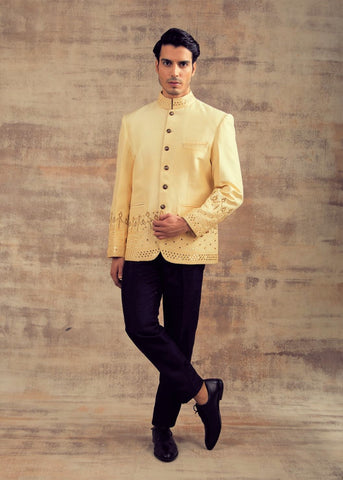 This Jodhpuri Jacket is in Banarasi Silk with Gold zari and Resham weaving. It can also be paired with any pastel colour Kurta Set or any pastel colour Slim Pants.